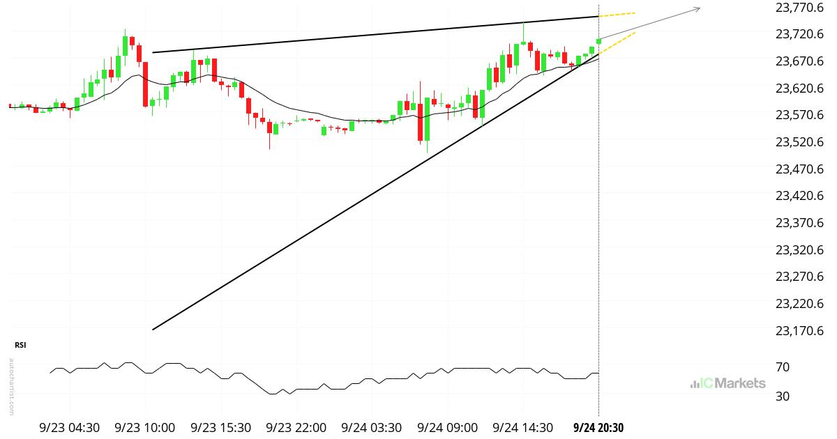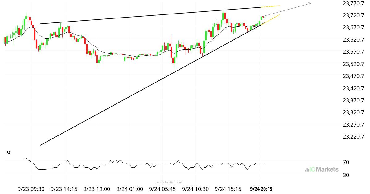 تم تحديد الوتد الصاعد في 9/24 20:15. لا يزال هذا النمط قيد التشكّل. توقعات بحركة سعرية صعودية محتملة نحو مستوى المقاومة 23,764.4 خلال الـ 8 ساعات القادمة. تحذير من المخاطر: ينطوي التداول في الأوراق المالية على مخاطر كبيرة. قد تتقلب الأسعار وقد تفقد الأوراق المالية قيمتها بالكامل. قد تتجاوز الخسائر قيمة الودائع. هذه المنتجات معقدة […]